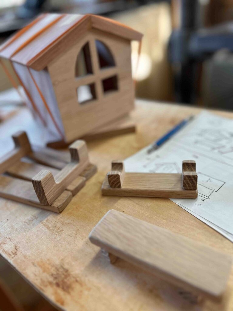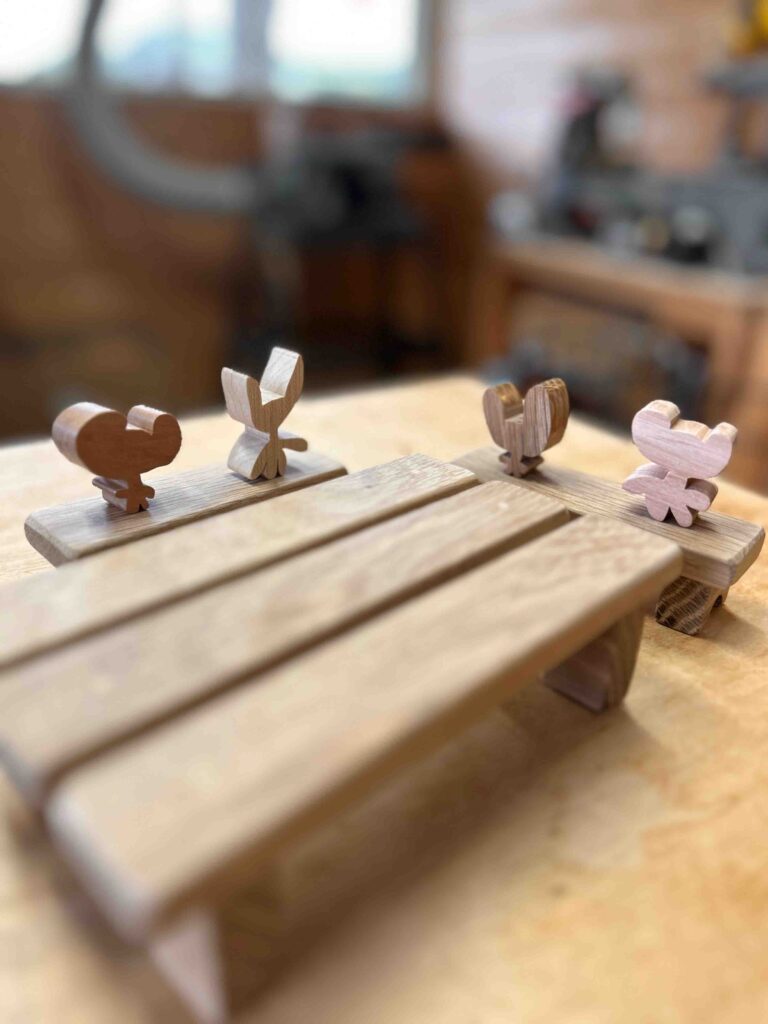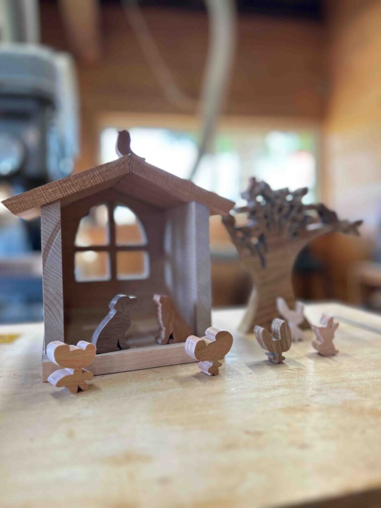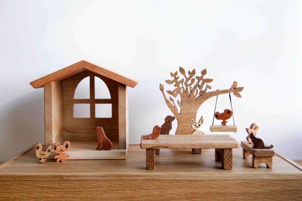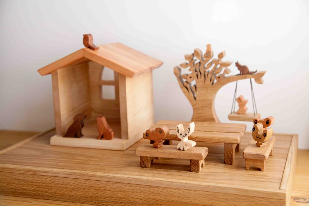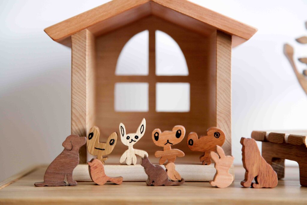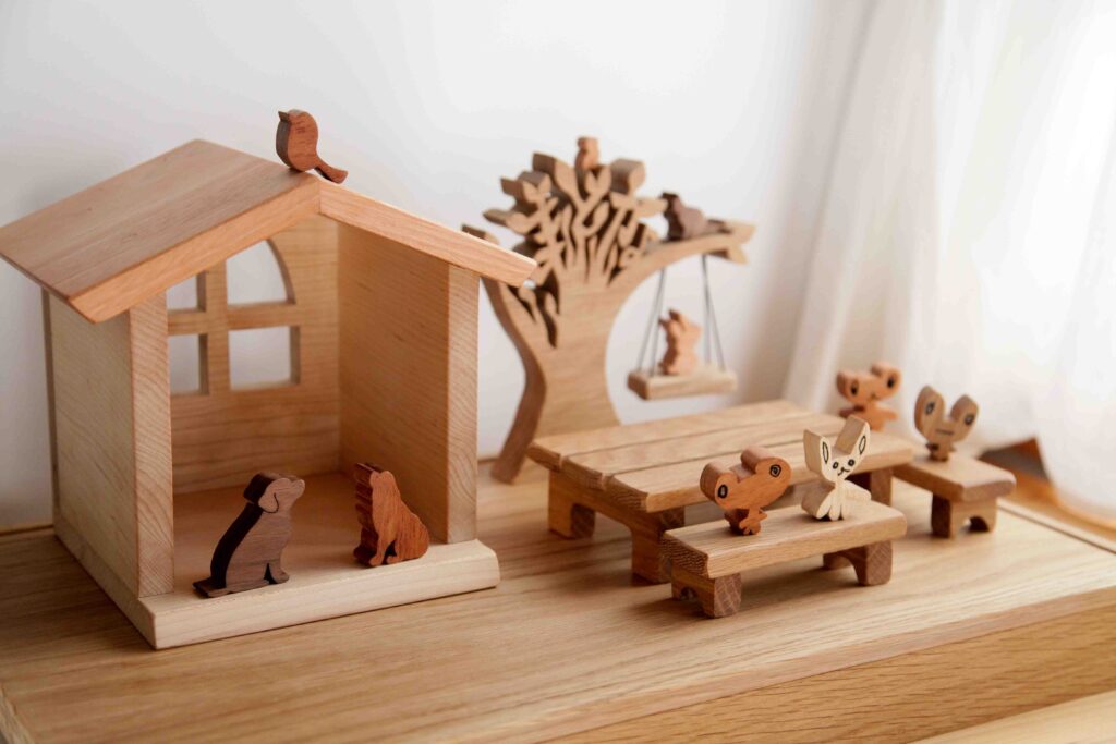 お母様は三姉妹を木のおもちゃで育てられたそうで、たましいのおうちの周りにも木のおもちゃの世界を広げてたまに遊びたいとのことで、お友達をたくさん作って集まれるおうちになりました。